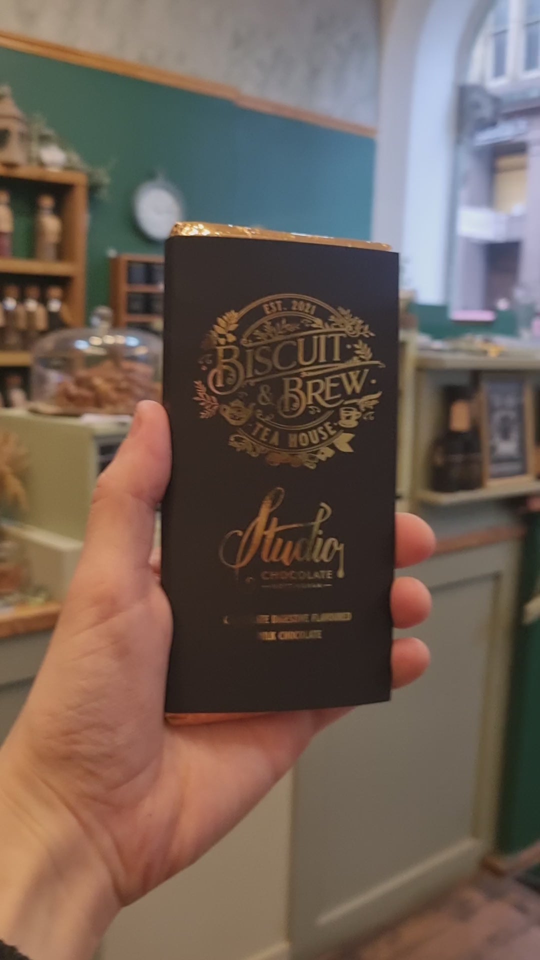 Chocolate digestive flavoured milk chocolate bar made in collaboration with Studio Chocolate using our signature Biscuit Brew black tea.